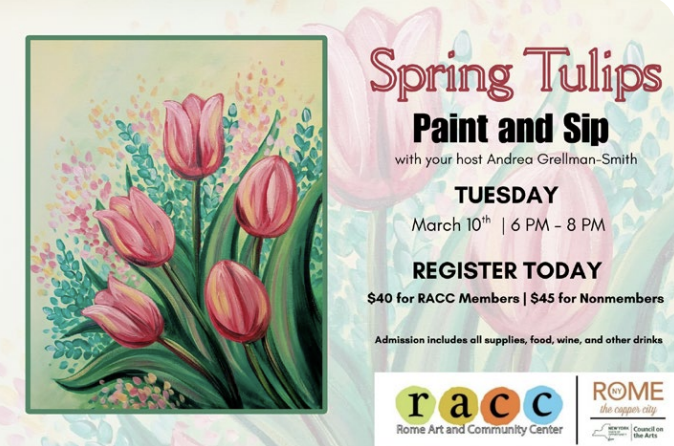 • March 10, at 6:00pm – 8:00pm: Spring Tulips Paint & Sip
