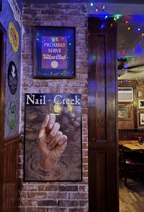 Be sure to try the “Jerry” wings, named after a customer who always ordered “Everything” wings with garlic Parmesan. Nail Creek now mixes it all into one scrumptious creation. The place is perfect for gatherings, and where in the world can you get a Utica Club as your side?