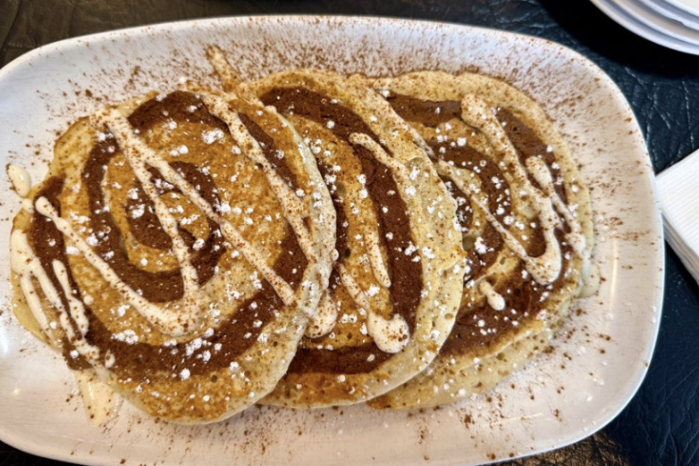 But the menu does not stop there. They offer classic buttermilk pancakes, chocolate chip pancakes, and specialty options that truly stand out. The Cinnamon Bun Pancakes are a showstopper. Buttermilk pancakes layered with a brown sugar cinnamon swirl, topped with homemade cream cheese icing and candied walnuts. It is everything you love about a cinnamon roll, reimagined in pancake form.