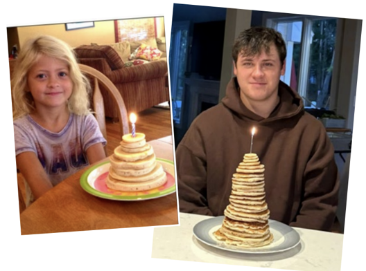 This past year, Luke’s stack was teetering at 23, and Lila’s was right behind at 20. It has become a tradition our friends and family expect to see every single year. Even when the kids are away at school, we still pull out the griddle and keep the tradition going, and yes, we have even traveled to New Hampshire with pancakes. It is the familiarity, the warmth, and the love that goes into making them that makes them such a special part of our lives.