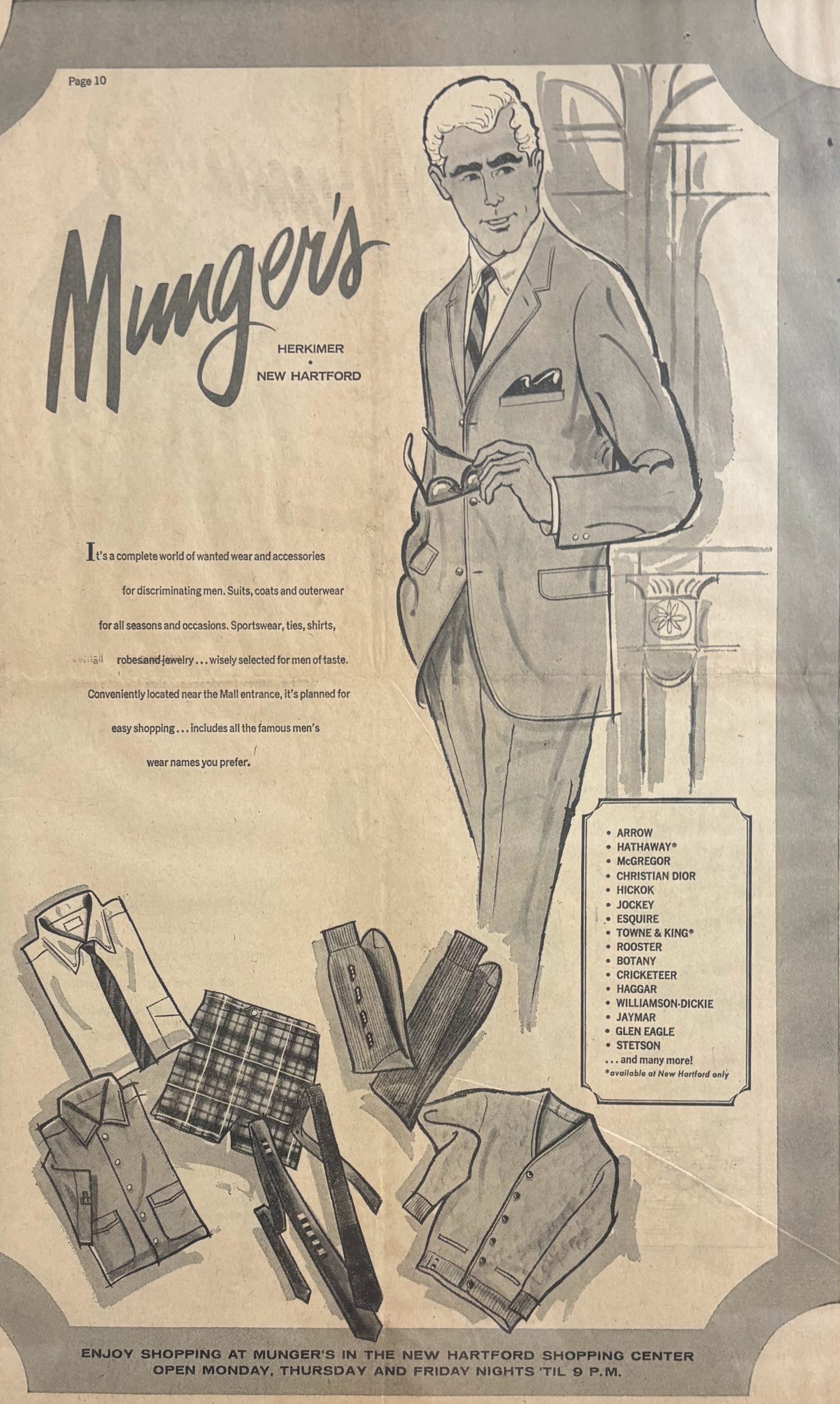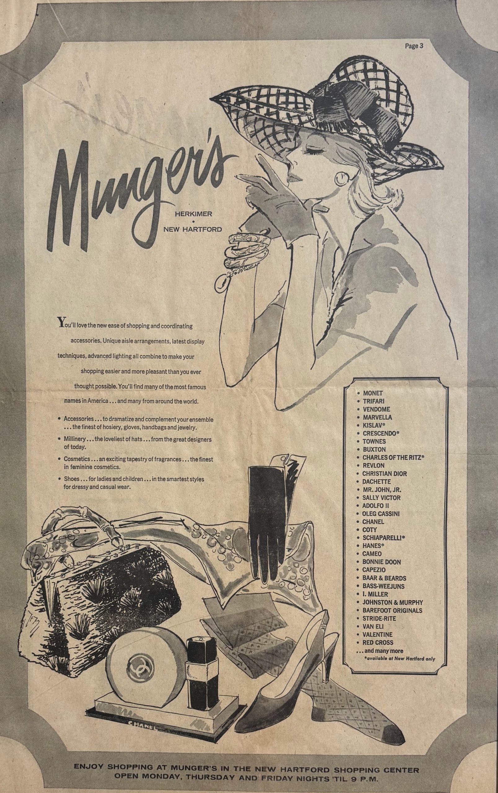 Where did people shop in the late 1800s? Munger’s, where their mission was “to let you be the judge and jury of your own satisfaction.” It was located in Herkimer on North Main Street and later in New Hartford, where it occupied space in the New Hartford Shopping Center in the 1960s.