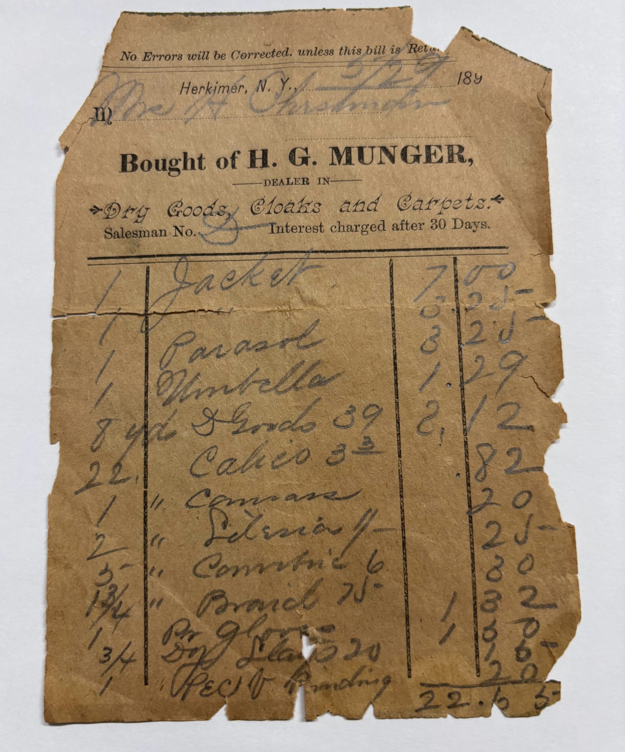 We had to consult Wikipedia for a few of their offerings (e.g., dolmans), but some of their other goods, namely silk, cashmeres, velvets, India shawls, and cloaks, were especially interesting, given how most of us walk around the Mohawk Valley today. An old receipt caught our attention, not only for what was purchased, a parasol,” but also for the cost of each item: a jacket for $7.00. And in a time when hats completed the outfit, there were hat boxes. These boxes struck us as a lovely indulgence, when today we are often asked if we want a bag for our merchandise.